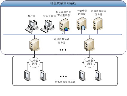产品说明: 随着现代工业的发展,电力负荷出现了很多新的种类和特点。一方面,出现了很多诸如电力机车、电弧炉、轧钢机等大容量的非线性和冲击性负荷。这些负荷的存在严重恶化了电力系统的运行条件,导致了功率因数低下、电压波动和闪变、三相不平衡、电力谐波等问题,不仅面临来自电力公司日益严厉的惩罚制度,而且对用户的用电安全和用电效率带来了极大的不利影响;另一方面,以精密机械加工、工业过程自动化、数据信息处理设备等为代表的新型工业负荷在电力负荷中的比重越来越大,因恶劣的电能质量导致用户生产经营损失的现象越来越严重。 电能质量在线监测与管理系统可以随时随地在线监测重点用户的电能质量状况,如:电压偏差、频率偏差、三相不平衡度、谐波、电压波动和闪变、暂态分量等,并可以实现电能质量历史记录的保存、查询,方便用户对电能质量的分析、评估和管理,能在供配电系统和用电设备运行失效之前,捕获到其早期的故障信息,以便在毁灭性打击之前,提醒人们对供、用电设备的运行状态进行调整和预防检修。对于提高电力系统供电的安全性、可靠性和经济性,保证用电设备的正常工作和工农业生产的持续高效,对于供、用电双方都具有十分重要的意义。总之,电能质量在线监测与管理系统是保证电力系统安全可靠和经济优质运行的技术支撑,是保证电网和用户电气设备安全和可靠的重要手段。 2.系统组成 电能质量在线监测与管理系统由主站系统、监测终端装置及通信网络组成,主站系统按功能由数据库、应用服务、Web服务及前置服务等几部分组成,基本架构示意如下图所示。